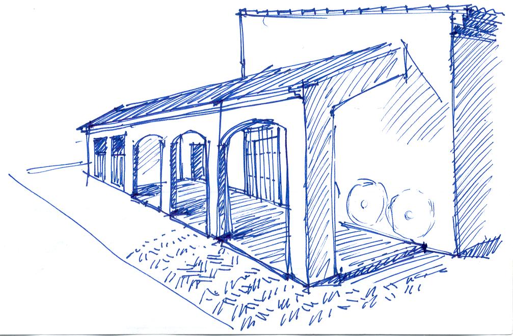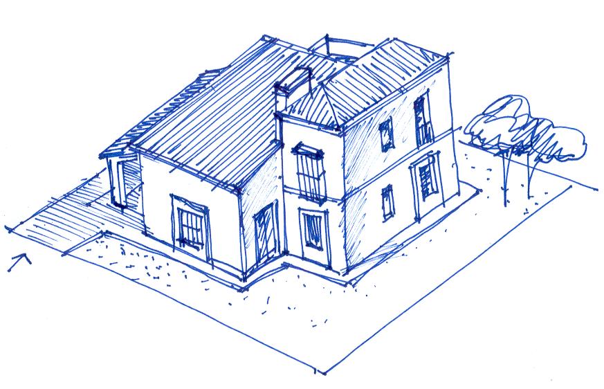 Fotos, bocetos en perspectiva y a mano alzada del arquitecto Honorio Aguilar para un proyecto de chalet en la urbanización La Pastora de la localidad sevillana de Cantillana.