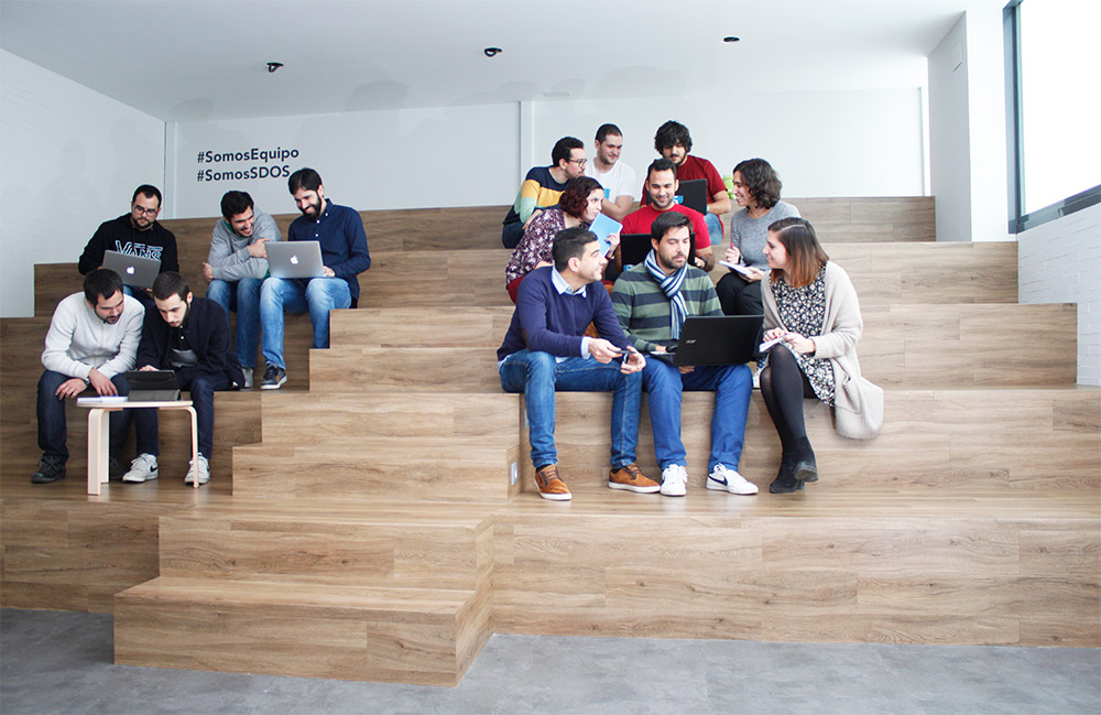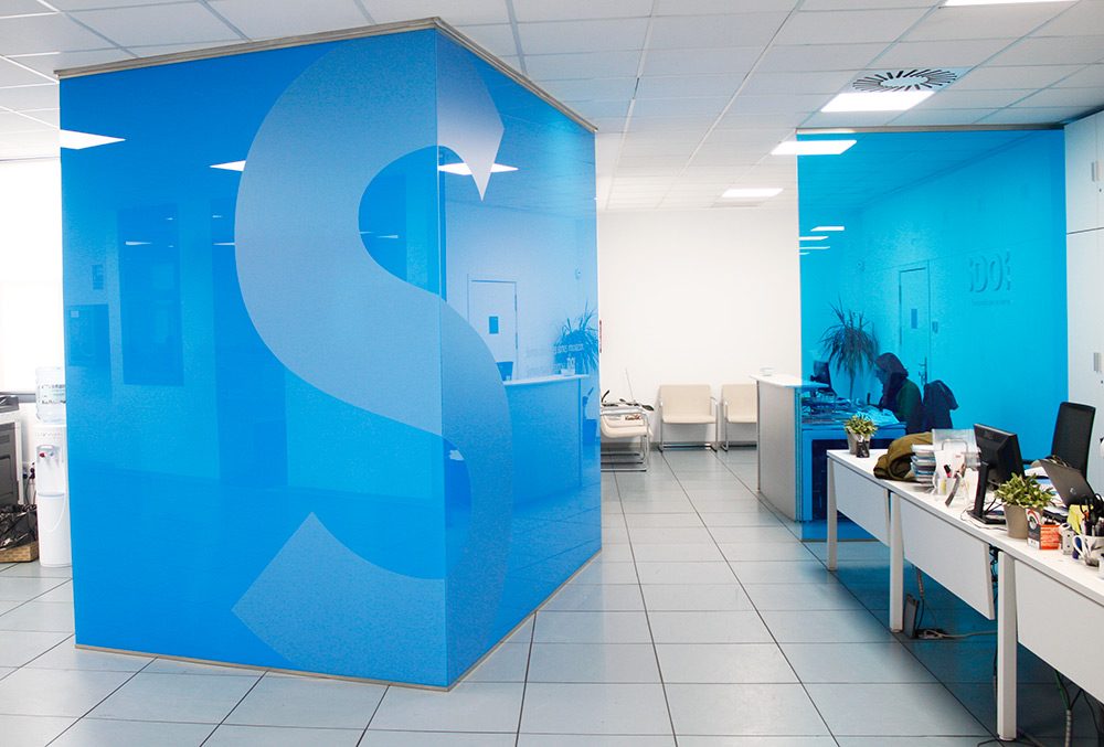 El proyecto de adecuación de oficinas para la empresa S-dos parte del concepto de trabajo en equipo, donde el espacio es concebido como un elemento continuo en el que sólo un cubo girado de vidrio en el color azul corporativo ubicado frente a la recepción y que indica el sentido del recorrido de las oficinas, y los grandes vidrios de una sola pieza de hasta 6 metros de longitud y la altura total del espacio, delimitan los despachos que a su vez sirven como salas de reuniones de los diferentes equipos de trabajo. El espacio es, por tanto, tan fluido como la actividad desarrollada por un equipo joven y dinámico. El simbolismo de la planta en U, diáfana, contrasta con el espacio central de la U inicialmente ocupado por una terraza del edificio original, la cual ha sido objeto de una ampliación de las instalaciones, proyectándose un lugar de encuentro o ágora, donde el graderío resulta un espacio polivalente para el diálogo, la formación y el esparcimiento.