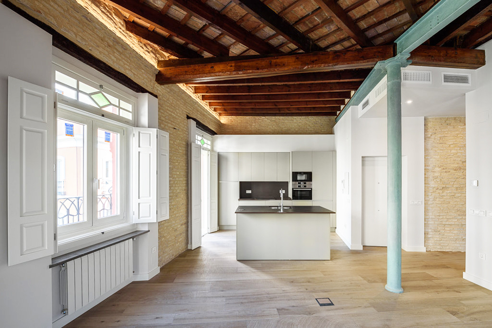 La riqueza de la estructura mixta que queda a la vista, el tableado de piezas cerámicas y los llagueados de ladrillo visto con mortero de cal, los antiguos suelos hidráulicos, la cerrajería recuperada de los grandes cierres acristalados o las fallebas de las contraventanas de madera restauradas han permitido que el interiorismo residencial de esta vivienda sea un espacio interesante y la enorme satisfacción del trabajo en equipo gracias a la actitud de su propietaria y el esfuerzo de la constructora Egión Obras y Proyectos.