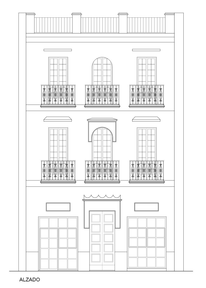 Alzado del proyecto en desarrollo que Estudio Honorio Aguilar tiene en la calle Galera de la zona de Sevilla conocida como El Arenal. El proyecto consiste en la rehabilitación de un edificio en el que se obtendrán cuatro viviendas.