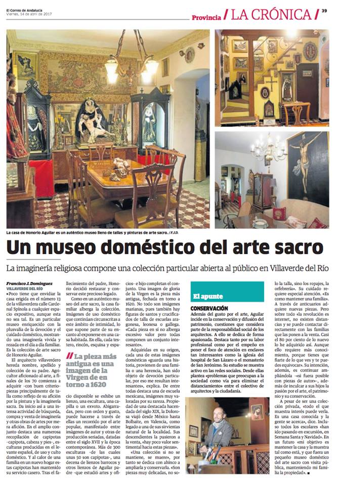 El periódico El Correo de Andalucía se ha hecho eco de la colección de Arte Sacro de la familia Honorio Aguilar. Con piezas que se remontan a varios siglos de antigüedad, procediendo las más antiguas de 1620, se encuentra expuesto en el domicilio que poseen en Villaverde y que, aún siendo de carácter privado, muestran a todas aquellas personas se interesan por visitar la colección.